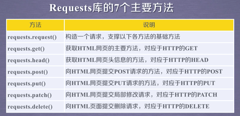 requests.get(url,params=None,**kwargs)requests.head(url,**kwargs)requests.post(url,data=None,json=None,**kwargs)requests.put(url,data=None,**kwargs)requests.patch(url,data=None,**kwargs)requests.delete(url,**kwargs)